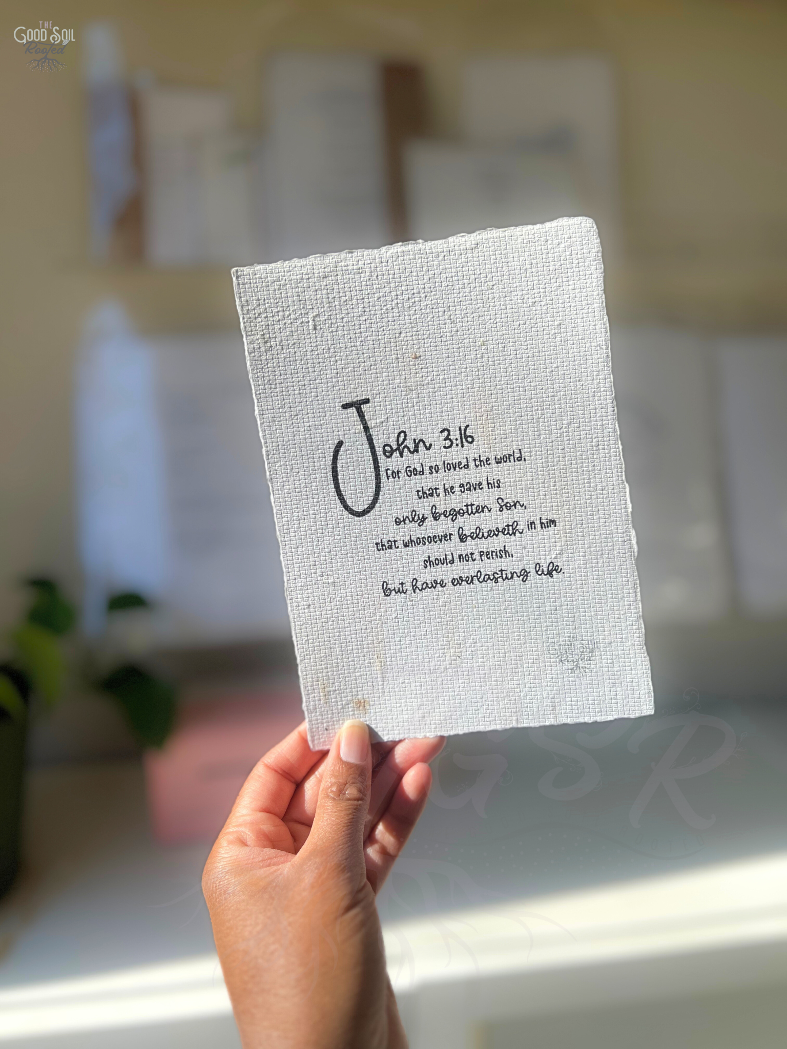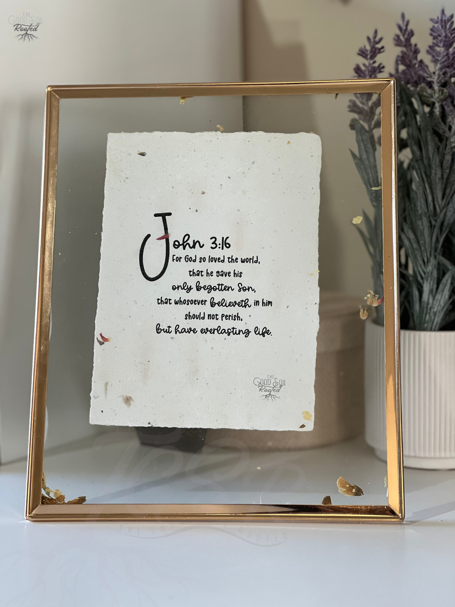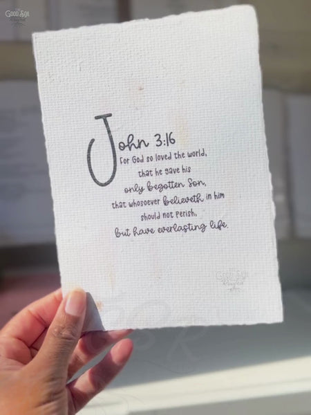 Experience the words of John 3:16 on beautiful handmade botanical paper, with deckle and hand torn edges. Let this timeless verse remind you of God's love and gift of everlasting life. Perfect for believers seeking a meaningful and elegant addition to their collection.
