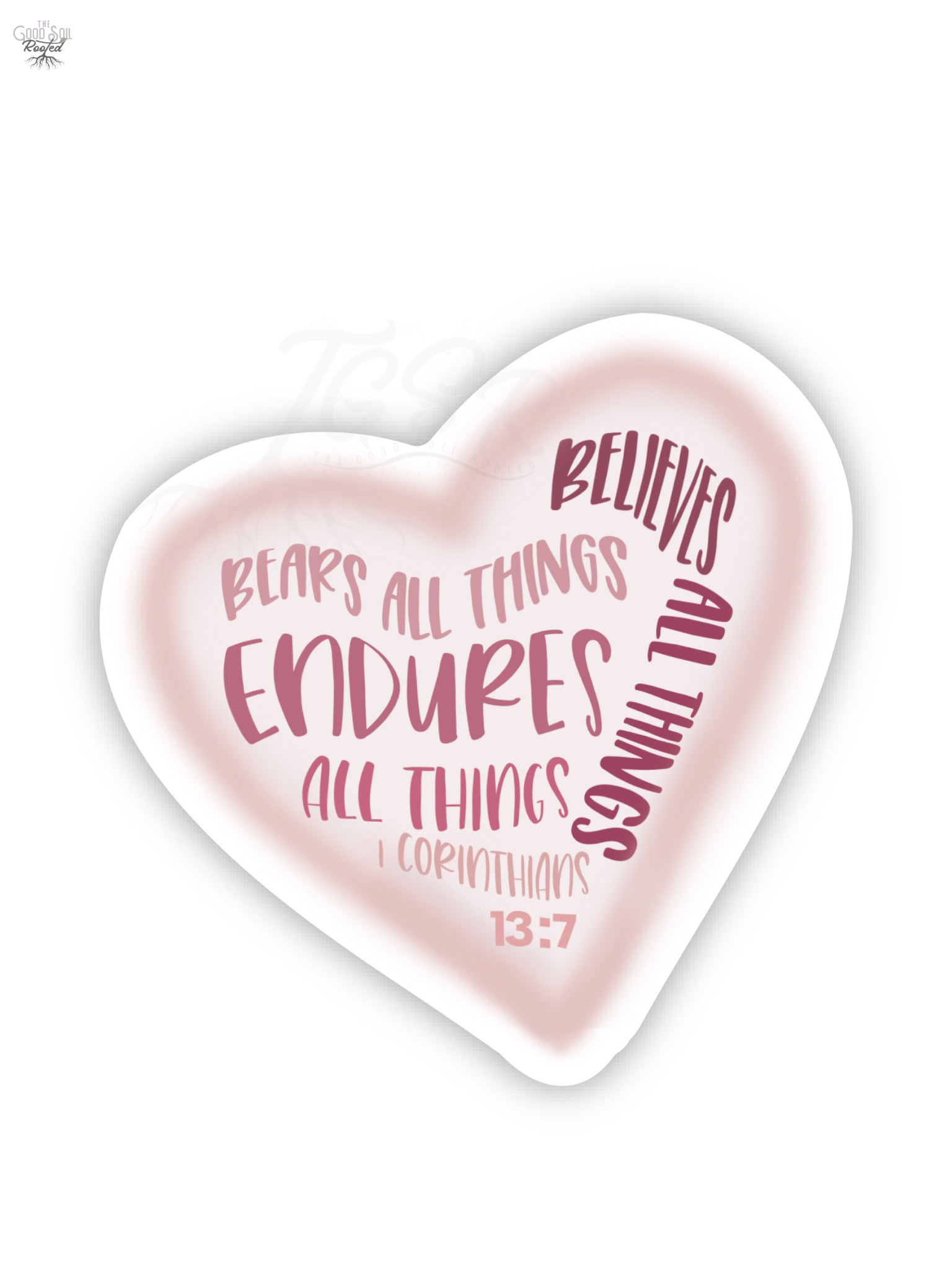 The cutest sticker! Love bears all things, believes all things, and endures all things. A reminder of the importance of love.